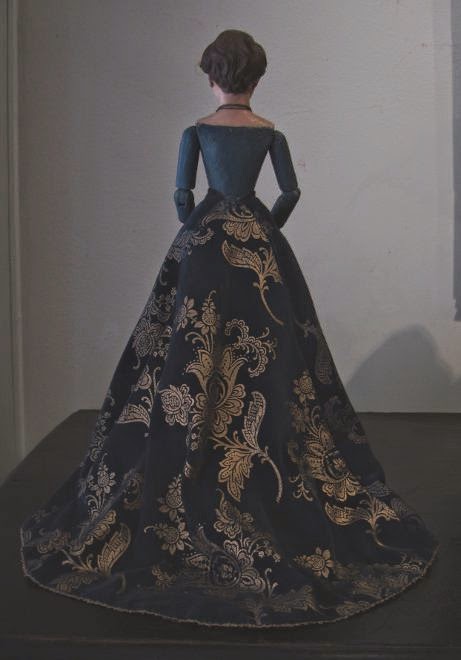 A saia, de um rico veludo azul, com ramagens douradas, cai em pregas profundas que vão abrindo. Espraia-se em  seu redor, formando uma pequena cauda.
